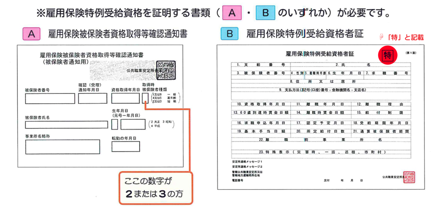 ❶ 現在、または直近の雇用保険被保険者証(コピー可)か特例受給者認定申告書